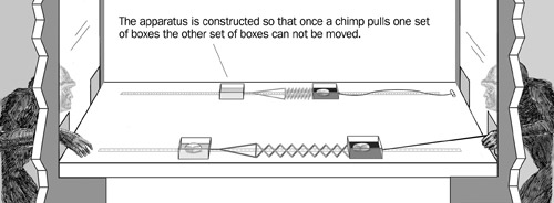 In study one, each subject was allowed to pull one of two tables toward itself. The first table contained bananas accessible to both the subject and its partner; the second table held fruit accessible only to the subject. Either way, subjects received the same reward. But because Jensen’s chimps predominantly chose the mutually accessible table in both the test (partner present) and control (partner absent) conditions, the results were inconclusive as to selfishness and mutualism. Nevertheless, Jensen vied, this initial phase of the experiment did show that his chimps were not averse to disadvantageous inequity, at least with regard to relative effort expended.